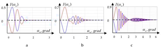 It is quite remarkable that the amplitude of the change in intensity is rigidly related to the value of the beam waist radius . The smaller the beam waist radius, the smaller the initial amplitude. For example, for a beam with a waist radius (Figure 5a), the maximum deviation of the normalized intensity from the average value () is . By the normalized intensity () value we mean the ratio of the intensity value measured at an angle to the highest (maximum) intensity value :. At the same time, the maximum deviation from the initial value in the intensities of the components for a beam with a waist radius (Figure 5c) reaches the value . Since the RCP and LCP intensity fluctuations are in antiphase for beams with a relatively large waist radius () already for the angle (see Figure 5), the intensity in the RCP component practically doubles, while the intensity in the LCP becomes vanishingly small. In fact, there is a conversion between LCP and RCP polarization. At the same time, for beams with a relatively small waist radius (), the intensity fluctuations are very small.