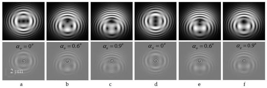 As can be seen from Figure 6d–f, the structure of an RCP component is very different from an LCP component. From the comparison of interference patterns Figure 6a,d, it can be seen that the charges of the axial vortices are the same, but the vortices in the first ring have opposite charges. When changing the angle , the unfolding zones for different components fall at different angles: for LCP components, on (Figure 6b), for RCP, on (Figure 6f). The entire complexity of the situation is already manifested in the example of beams with a relatively large waist radius (see Figure 7).