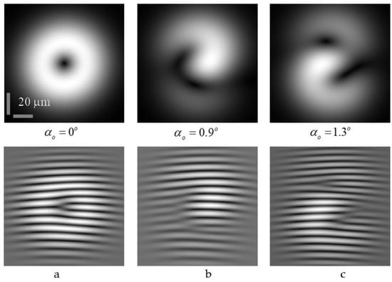 It can be assumed that when the beam is tilted in the plane, the axial vortex at certain angles will encounter vortices with identical signs of topological charges, and at first glance, instead of unfolding, we should obtain a doubling of the topological charge on the axis in certain planes of the crystal. To find out the correctness of such an assumption, it is necessary to study the evolution of the fine structure of scalar singularities. By the concept of fine structure [21], we mean not only the polarization structure (C-lines and L-surfaces), but also the structure of the topological charge of a singular beam. A characteristic interference pattern in the region of convergence of vortices with the same charge signs is shown in Figure 11.