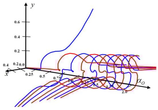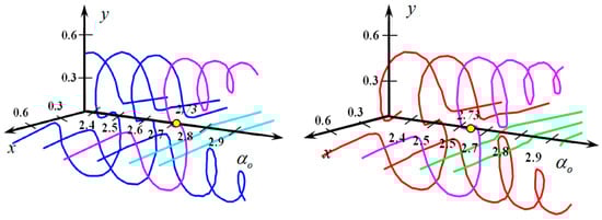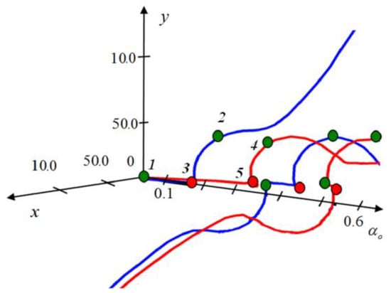 As in the case of excitation of a crystal by a beam with circular polarization, for linear polarization we can distinguish four main sections of the trajectory in which the structure of the lines and the course of topological reactions are different: (1) the initial section in the vicinity of the angle ; (2) an intermediate section up to the region of critical angles; (3) the region of critical angles; and (4) asymptotic region at relatively large angles or large crystal lengths . Figure 8 corresponds to the first two corner sections. As can be seen from the figure, regarding value , before, the changes in the trajectories are quite small, but after this angle, the number of trajectories of C-points increases, and the trajectory becomes much more complicated.