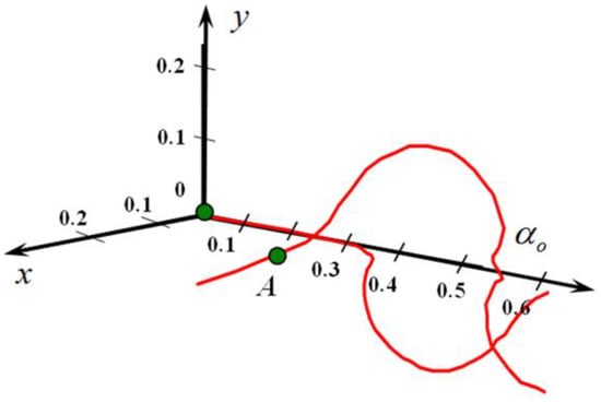 We see that the axial vortex in the RCP component propagates without external disturbances at small tilt angles. As it approaches the polarization singularity unfolding plane at (see Figure 12), a dipole pair of vortices is born near the axis at point A (green circle); one of them quickly moves away from the beam axis, and the second negatively charged vortex approaches the axial one and the negatively charged vortex. However, as it approaches, repulsion of the trajectories occurs. Therefore, a vortex with a double topological charge does not arise. However, at the same time, a vortex propagates along the axial trajectory in the LCP component, creating the appearance of polarization unfolding. In contrast to the case of the polarization tilt angle , where true unfolding occurs, accompanied by the event of vortex annihilation in one of the components, in the case of the vortices do not annihilate in one of the components, but simply leave the beam. Therefore, polarization unfolding as such does not occur.