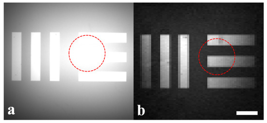 Performance comparison for glare suppression in widefield imaging and confocal single-pixel imaging. Red dotted circle is a guide to the eye showing the center of the glare where information is totally erased due to saturation for (a) conventional imaging, whereas (b) only light originating from the object is selectively gated using confocal single-pixel imaging. Scale bar: 1000 µm.