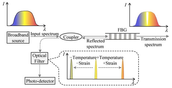 Figure 1 shows the working principle of an FBG. According to Bragg’s law, when a broadband source of light is injected into the fiber, the FBG reflects a narrow spectral part of light at a certain wavelength, which is dependent on the grating period and the reflective index of the fiber [9,27]. The Bragg wavelength can be calculated by: