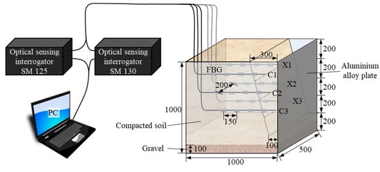 For the experiment, the FBG sensor demodulation system used two sensing interrogators, SM130 and SM125, produced by Micron Optics Inc. (Atlanta, GA, USA). They were the core device of the entire sensor network. The sensing arrays are illustrated in Figure 3, which consists of a single-core optical fiber containing six FBGs connected to the two demodulators controlled by a computer. Each FBG weld joint was protected by heat shrinkage tubes with diameters of 2 mm and 1 mm to improve the deformation compatibility between the sensors and soil mass. A total of three FBG horizontal layers were laid in the slope, and each layer was divided into two groups named C1, C2, C3, X1, X2, and X3. The horizontal distance between the two groups was 20 cm with a symmetrical distribution, and the horizontal distance between adjacent gratings in the same layer was 15 cm. Each FBG array was connected to four FBG sensors named 1 to 4 from left to right. Before testing, the initial wavelengths of FBG were recorded, and the frequency of the sensing interrogators was set to 1 Hz, with data recorded every 1 s. When the filling height (including the rock layer) reached 40 cm, 60 cm, and 80 cm, the FBG sensors were placed at the specified position of the slope. The procedure was repeated until the full height of the model slope was obtained.