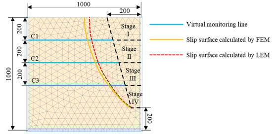 Figure 6 also shows the critical slip surface calculated by the LEM. Theoretically, the critical slip surface in the soil should be consistent with the abnormal strain zone. However, the critical slip surface calculated by the LEM does not always coincide with the maximum horizontal strain zone of the slope. As the safety factor is 1.09 after excavation (according to Bishop’s simplified method), the slope is about to slide. Therefore, there is a large plastic zone in the soil mass that cannot accurately identify the slip surface. Furthermore, the above FEM assumes that the slope is an ideal elastic-plastic body, and the nonuniformity and the non-linear constitutive relation of the slope cannot be accurately reflected [31,32]. This may be the reason for the inconsistency between the critical slip surface and the abnormal strain zone.