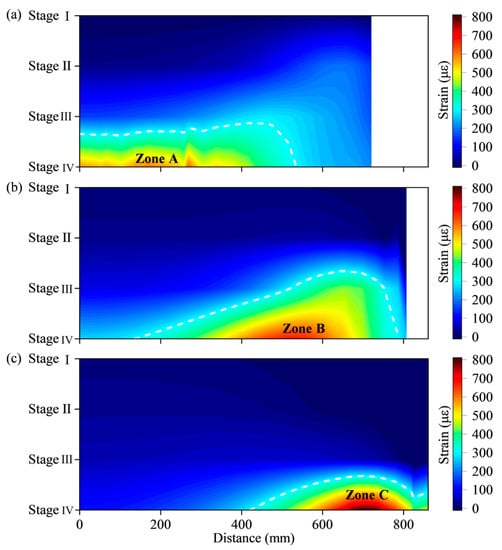 Figure 6 shows the horizontal strain distribution during the excavation of the four steps. In stage I, the slope mass’s strain value was very small, but the foot of the slope mass was subjected to compressive strains, indicating that the surrounding soil was in a compression-shear state, which truly reflected the stress state under excavation. With continued excavation, the strains of each part of the slope increased rapidly, and the horizontal strains near the slip surface were all distributed unevenly. The horizontal strain distributions of other elevations showed a similar pattern. Stage IV showed that the inhomogeneity of the strain distribution in the soil mass was obvious after the completion of the excavation, reflecting the gradual accumulation of shear strain on the slip surface.