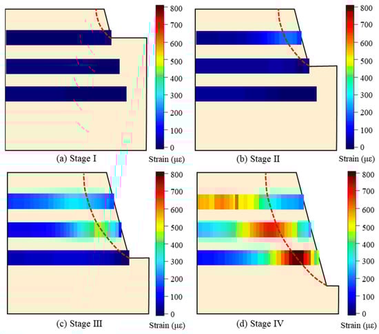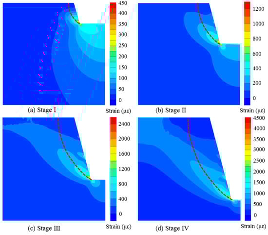 Figure 7 presents the contour of shear strain in the slope during the excavation process, with the critical slip surface obtained through the strength reduction method (SRM) indicated by the red dashed line. As excavation proceeds, the shear strain at the foot of the slope increases rapidly, and the range of shear strain develops from the foot to the top position, indicating the gradual formation of the critical slip surface. This observation is consistent with the location of the potential sliding surface shown in Figure 6. Therefore, the distribution of the horizontal strains can effectively reflect the stress state within the soil mass. In actual engineering construction, monitoring the strain at the foot of the slope is crucial, as it allows for the timely understanding of strain development in the internal area of the slope.