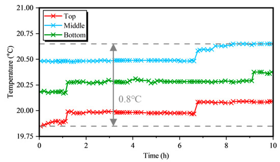 As the experiment was conducted in an underground laboratory, which was almost in a constant temperature environment, the monitoring results from three thermometers indicated that the temperature change was consistent with our expectations, as shown in Figure 8. It was observed that the temperature variation during the test process was within 0.8 °C. Therefore, the necessity to compensate for the effect of temperature on strain measurement can be negligible.