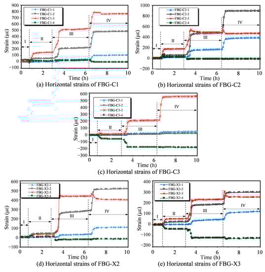 In stage I, the horizontal strain was negligible, indicating that the soil was not significantly affected by the excavation. However, FBG-C1-4 showed a slight increase in strain, implying a right sliding trend near the slope face, resulting in momentary tensile strain. Similarly, likely due to the proximity of the excavation location, FBG-C2-4 and FBG-X2-4 also experienced sudden strain instability in stage II.