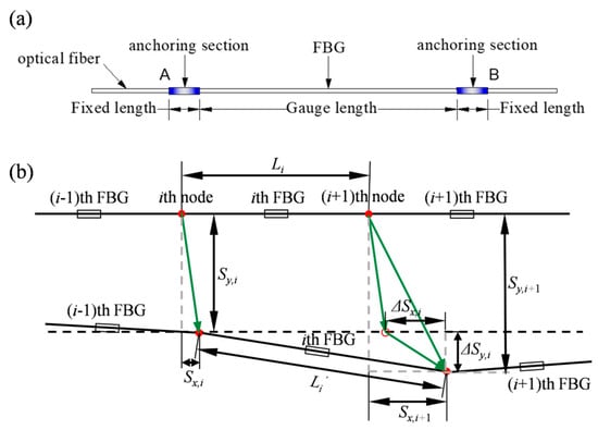 Figure 10b reveals the deformation mechanics of the FBG fiber grating subjected to external forces. Sy,i and Sy,i+1 represent the vertical displacement of the i-th node and the i+1-th node, respectively. When FBGs are subjected to external forces, the distance between two adjacent nodes is increased from Li to , and the axial strain εx can be expressed by