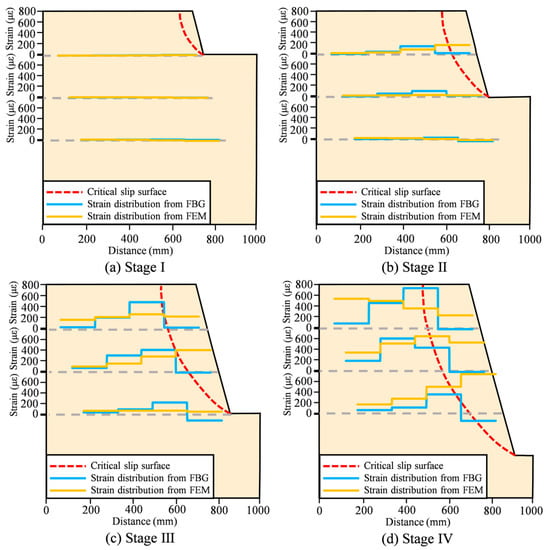 An algorithm and a MATLAB program were developed and applied to process the data obtained from the FBG sensors and FEM, and the results are plotted in Figure 11. The strain distribution curves from both the FBG sensors and FEM are projected in the slope model, represented by orange and blue lines, respectively. The critical slip surface is illustrated by dashed red lines calculated by the LEM. As shown in Figure 11, the strains of the optical fiber gradually increase during the excavation process, and the strains accumulate adjacent to the points of intersection of the fibers and the critical slip surface overall. The strain peaks of the soil mass appear in the middle area compared to either side. Furthermore, the monitoring results and numerical simulation results are in general agreement, which demonstrates that the intermediate position of the soil mass is within the range of the critical slip surface.