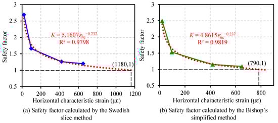 According to the calculation results, there is a good correlation between horizontal characteristic strains and safety factors. The results indicate that it is possible to evaluate slope stability conditions using strain measurements. However, the values of critical strain thresholds corresponding to slope instability are also dependent on the selection of slope safety factor calculation methods. This variation needs to be considered in practical applications. As shown in Figure 12, if the safety factor is set to 1, the corresponding characteristic strains calculated by the Swedish slice method and Bishop’s simplified method are 1180 με and 790 με, respectively. For safety reasons, 790 με is suggested as the critical characteristic strain threshold for instability prediction for this slope model.