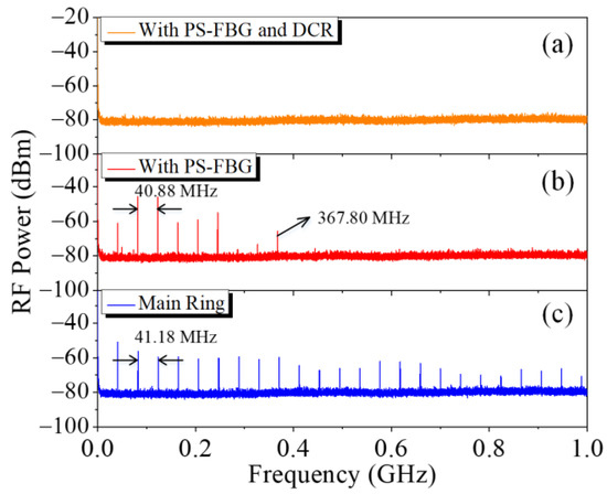 The SLM selection capability of the DCR filter was also confirmed by replacing it with an identically sized SMF in the laser cavity. The beating spectrum is shown in Figure 6b. Multiple beating signals were clearly observed, indicating that the THDFL was operating in a multi-longitudinal-mode (MLM) state. The spacing between adjacent peaks was approximately 40.88 MHz, corresponding to a longitudinal-mode spacing of 40.88 MHz. Notably, the maximum beating signal frequency was 367.80 MHz, suggesting that the FWHM of the PS-FBG should have been ~367.80 MHz.