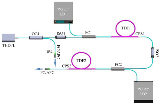 The SLM THDFL output was amplified with a self-built Thulium doped fiber amplifier (TDFA) system to achieve a high-power output, as shown in Figure 7. A 10% output was extracted through a fiber coupler, OC4 (10:90), to monitor the performance of the SLM THDFL, whereas the remaining 90% laser was amplified by the TDFA system after passing through an isolator. The primary amplifying stage consisted of a 793 nm laser diode (LD1) with a maximum output power of 12 W, a (2 + 1) × 1 fiber combiner (FC1), a 2.6 m Thulium-doped fiber (TDF1, Nufern, SM-TDF-10P/130-M, East Windsor, CT, USA), and a self-made cladding power stripper (CPS1). The secondary amplifying stage included a 793 nm LD2 with a maximum output power of 30 W, a (2 + 1) × 1 FC2, a 3.0 m TDF2, and a CPS2. An additional isolator was introduced between the two stages to ensure unidirectional laser transmission.