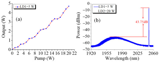 The evolution of the TDFA system’s output power as a function of the LD2’s pump power was measured using a power meter with LD1 pump power of 5.0 W, as shown in Figure 8. At a LD2 pump power of 20.0 W, the output power reached 4.7 W; the power meter’s damage threshold was 5.0 W. The spectrum of the amplified laser was measured using the OSA, as shown in Figure 8b, where the power was attenuated before the OSA. The OSNR was 43.75 dB in this case, and there was no self-excited oscillation at the maximum gain near 1970 nm, indicating satisfactory performance of the TDFA system.