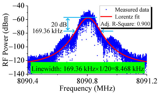 The linewidth of the Brillouin laser was narrower than that of the pump laser [41,42], and a linewidth compression factor of 1/18 could be achieved according to the theory described in [43]. Thus, it was possible to determine the linewidth of the THDFL by analyzing the RF signal obtained from beating the Brillouin laser and its pump laser. As a lasing linewidth broadening effect could be caused by phase noise and self-phase modulation in the TDFA system [44] the 10% output laser of the THDFL from OC4 was combined with the Brillouin laser at OC6 to obtain the RF beating signal in our measurement setup, which was then measured using a 12.5 GHz PD and an ESA. Figure 11 displays the measurement data and corresponding Lorentz fitting curve. The 20 dB bandwidth of the spectrum was 168.36 kHz. Accordingly, by applying a calculation factor of 1/20, the linewidth of the THDFL was calculated to be 8.468 kHz.