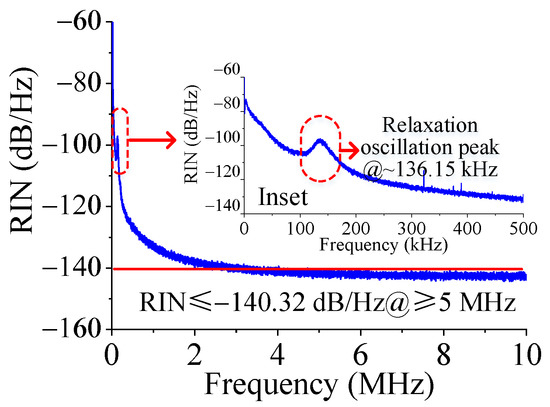 RIN spectrum measured in 0–10 MHz range; RIN spectrum measured in 0–500 kHz range (inset).