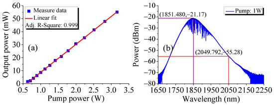 The laser output power was analyzed at different pump power levels using a power meter. Figure 14a shows the measured data and linear fitted curve. The laser showed a slope efficiency of 2.15% and threshold power of 436 mW. The output power, reaching 55.1 mW at a pump power of 3.16 W, had not yet reached saturation. To prevent potential damage to the devices in the laser cavity due to high pump power, the maximum output power was not measured. When the pump power was 1.0 W and the direction of the signal light was opposite to the direction of the pump light, the ASE of the 1.6 m gain THDF at 2049.792 nm was 34.11 dB lower than that at the maximum gain wavelength (1850 nm) (Figure 14b). This indicated that the maximum gain wavelength differed significantly from the output wavelength of our THDFL. Additionally, the insertion loss of all devices used in the 2 μm band was considerable. These factors contributed to the low slope efficiency of the THDFL.