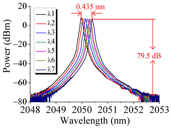 The PS-FBG and UFBG were clamped onto the micro-displacement platform, as shown in Figure 1, then the wavelength-tunability of the THDFL was investigated by tuning the right knob of the micro-displacement platform to stretch the PS-FBG and UFBG horizontally. The operating wavelength of the THDFL was tuned from 2049.962 nm to 2050.397 nm with a tunable range of ~0.435 nm, as shown in Figure 15, which performed a groundbreaking demonstration of the feasibility of laser wavelength tuning in a fiber laser through the simultaneous stretching of both the PS-FBG and the UFBG, validating its potential for practical applications. The OSNR of the THDFL within the wavelength-tunable range was no less than 79.5 dB. A larger wavelength-tuning process was not performed, however, to avoid damaging the PS-FBG and UFBG. Achieving a large tunable range will be our focus in future work.