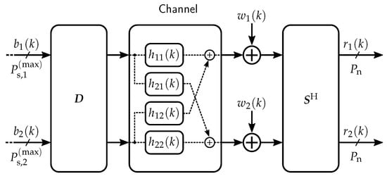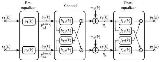 The proposed transceiver–joint equalization technique in a MIMO system is analyzed using an electrical system model with , where and represent number of transmitters and receivers, respectively. In Figure 1, a MIMO transmission model with is segregated into three parts, namely the transmitter, the channel, and the receiver. The symbols utilized in the system model are described in Table 1. The MIMO transmitter consists of a serial-to-parallel (S/P) converter and a pre-equalizer. Using the S/P converter, encoded serial binary data are transformed into parallel data streams, where represents the total number of MIMO inputs. The parallel symbol streams , with and are mapped on to -ary PAM constellation. The bit-to-symbol mapping is conducted using Gray coding as it improves the system performance. The transmit symbol space of , where , consists of symbols in accordance to the chosen -ary PAM constellation. It is worth noting that the symbols in are independent and identically distributed. The amplitude of the symbols is defined as