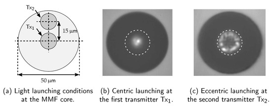 In (a), the transmitter’s configuration for launching the light into an MMF core is depicted. Measured mean power distribution with (b) centric (offset: μm) and (c) eccentric (offset: μm) light-launching conditions into an MMF core, which is represented by the white dashed circle.
