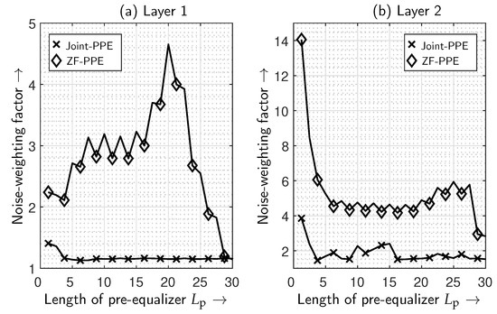 Noise weighting factor with increasing number of pre-equalization coefficients, where a layer-wise comparison between the proposed joint-PPE scheme and the ZF-based PPE is exhibited.