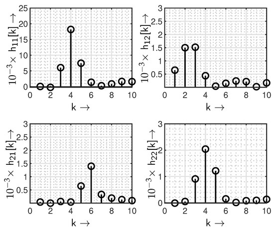 Prior to the system performance evaluation, the measured channel impulse response of a 1.4 km MMF is illustrated in Figure 7. The measured channel state information is obtained using an SDM-based optical MIMO experimental setup with offset launching conditions into an MMF. Afterwards, the estimated channel contains dispersion impairments and mode-dependent losses in accordance with the excited mode groups. This channel information is incorporated in the computer simulation to imitate the SDM technique. From Figure 7, it is clear that both MIMO layers are adversely affected due to crosstalk , when . Additionally, a significant amount of ISI is also observed due to differential mode group delays.