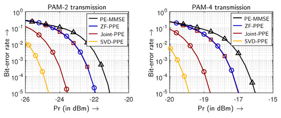 The proposed joint-transceiver equalization system performance is compared with the conventional ZF-PPE and PE-MMSE. The BER performances using PAM-2 and PAM-4 transmissions are demonstrated in Figure 8 and Figure 9. The enhancements in the average received power compared to the PE-MMSE are presented in Table 2 at a BER of . The BER results prove that the joint-PPE outperforms the ZF-PPE and PE-MMSE. Additionally, the BER performance of the joint-PPE can be advanced using the SVD-based joint-PPE. Under the first PAM-2 transmission scenario, a gain SVD-PPE of ≈3.52 dB is observed in comparison to PE-MMSE. Similarly, the performance improvement of ≈2.54 dB is marked while solely using the joint-PPE. The joint-PPE scheme achieves an identical BER performance with only half of the optimized pre-equalizer taps compared to the ZF-PPE. It is evident by the overlapping BER performances of the joint-PPE with and ZF-PPE with . Considering the PAM-4 transmission on both MIMO inputs under the second scenario, a slight improvement is noted in comparison to the first scenario. The joint-PPE in conjunction with SVD yields the best system performance, surpassing PE-MMSE by ≈3.86 dB. The joint-PPE single-handedly achieves a gain of ≈2.73 dB compared to PE-MMSE. An improvement in of ≈1.13 dB indicates that the proposed joint-PPE enhances the system performance to a higher extent than the conventionally deployed ZF-PPE.