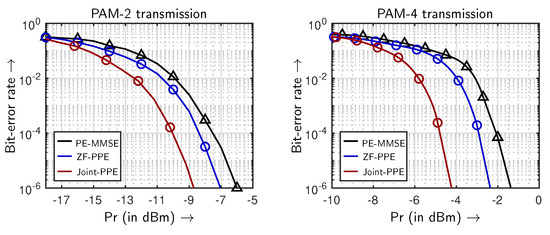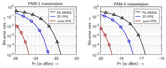 BER dependent on simulated received power for PAM-2 and PAM-4 transmissions. The BER values associated with and are represented with the square and the circle markers, respectively.