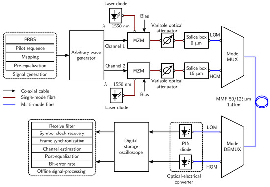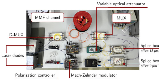 Starting from the transmitter side, a S/P converter is applied to convert a serial data stream into two pseudo-random binary sequences (PRBSs). Afterward, these sequences are mapped on the Gray coded symbols in accordance with the chosen PAM-2 or PAM-4 modulation formats. Additionally, the pilot symbols are also appended to the data symbols for the purpose of channel estimation. By using the above-mentioned optimization statement, the optimal pre-equalizer coefficients are computed using channel information. Consequently, multi-level signals are enabled by applying pre-equalization to the input data streams. In case no channel state information is available, the pre-equalizer acts as a Dirac delta function, and the results for the PE-only are obtained. The signal-generation process is concluded by generating the electrical signals from the input symbols using an arbitrary waveform generator (AWG). The channels of the AWG are operated on the symbol rate of GBaud per MIMO layer. The electrical signals are converted into the optical signals using chirp-free external Mach-Zehnder modulators (MZMs). A lithium-niobate (LiNbO3) substrate is used in the optical circuit of the MZM. The bias of the MZM is manually adjusted, and the quadrature points are stabilized using a temperature controller. The carrier laser sources work on the operating wavelength nm. Using variable optical attenuators (VOAs), the overall BER performance is calculated over a distinct range of the average received optical power (). Thereafter, the MMF splice boxes are utilized for the excitation of the selective mode groups by launching the light with a certain offset. In this provided experimental setup, the SDM scheme is enabled by utilizing centric and eccentric launching conditions into a 1.4 km long MMF with the offsets of μm and μm, respectively. The offset light-launching conditions are demonstrated in Figure 2 and Figure 10. Centric launching of the light into the MMF results in the excitation of the fundamental mode group or lower-order mode (LOM) group. Similarly, the high-order mode (HOM) groups are excited with the μm offset launching condition. The last part of the transmitter includes an optical fusion coupler, which is useful in multiplexing the mode groups. In this setup, custom-made fusion couplers are utilized with a slight asymmetric power split ratio as these are well suited for mode multiplexing (MUX) applications [31,32]. The function of a mode MUX is to combine the LOM groups with HOM groups using an x-shaped structure. The LOM groups travel from the center of the fiber core. Thus, these groups are more likely to travel in a transverse direction. However, the HOM groups couple with LOM groups because of their wider electric field distribution. The mode MUX and mode demultiplexer (DMUX) have 45% power-splitting ratio with ≈3 dB insertion loss.