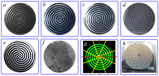 Photographs of axicons used in this work. (a–f) Silicon helical binary axicons with diameters of 50 mm. (a–e) Axicons with and period mm. (f) Axicon with and mm. (h) Diamond holographic axicon with a diameter of 20 mm and . (g) Yellow lines: local normals to Archimedean spiral of axicon shown in (c); red circle: evolute of spirals. (c). Axicons form beams with positive topological charges when the initial Gaussian beam is incident normally onto the axicon surface. To generate beams with a negative topological charge, the axicons should be rotated by about the vertical axis. The aperture of the axicons was limited by frames, and their radii are indicated in Table 1.