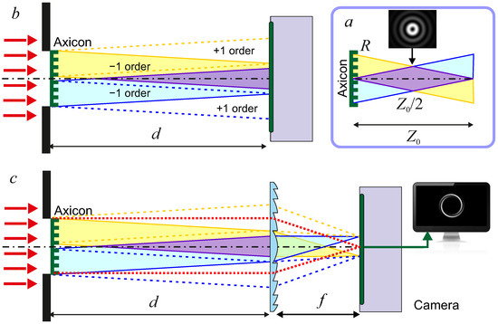 As shown in Figure 2a, the distance at which the waves of negative diffraction order intersect depended on the diffracting beam radius, which was limited either by the diameter of the illuminating beam or by the diameter of the axicon frame. The radii of the axicon apertures in the experiments are presented in Table 1. The Bessel beams were formed within the diamond-shaped area, which is highlighted in the figure in purple, and collapsed at a distance of . Divergent beams of the first positive order of diffraction did not participate in the formation of a Bessel beam, but in the case of a large-diameter lens installed in the optical system, as shown in Figure 2c, they contributed to the formation of the Fourier transform of the beam.