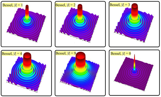 which occupies all free space and has an infinite width and, therefore, infinite energy. Here, is the radial wave number, is the azimuthal angle, is the axial component of the wavevector , and l is the azimuthal quantum number, known as the “topological charge” (TC). The function can be expanded to a superposition of conically converging plane waves