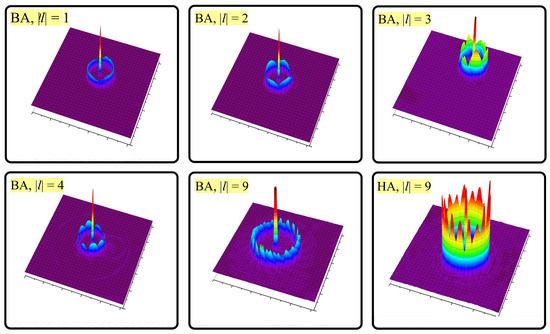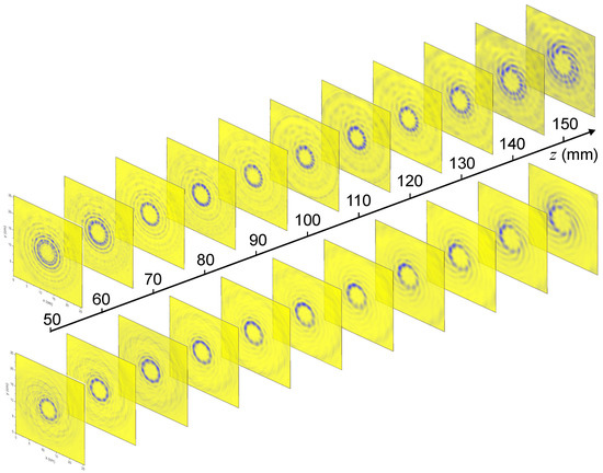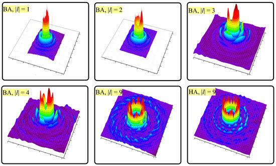 First, we compared the experimentally obtained distributions with the ideal Bessel beams shown in Figure 3. We can see that the diameters of the rings of the experimentally obtained beams, particularly their first rings, are nearly identical to those of the rings of ideal beams, but there are also significant differences. In the experiment, the intensities of the Bessel rings clearly varied in azimuth. In the case of the binary helical axicons, the number of peaks corresponded to the topological charge of the beam . At , the beam was almost symmetrical (the beveling of the beam can be explained by the inhomogeneity of the axicon illumination), and at higher topological charges, this dependence was also evident. We explain this effect below.