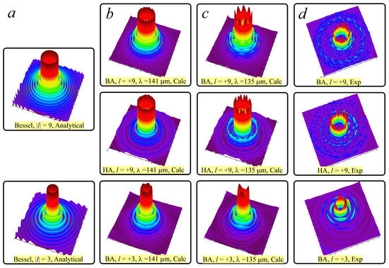 Next, we compared (see the right column in Figure 4) the Bessel beams with the same topological charge but created by different types of axicons. It can be seen that near the optical axis, the Bessel beams with formed by the binary helical and holographic axicons were very similar; however, the beam formed by the HA had 18 azimuthal lobes instead of 9, as seen in the case of the binary helical axicon. However, at the periphery, the structures of the beams exhibited significant differences. Instead of the spiral structures discussed in the case of the BA, the beam formed by the HA was axisymmetric, and in terms of intensity distribution, it was closer to the ideal Bessel beam. Although weaker, the symmetrical outer ring observed for the HA case can also be attributed to the diffraction of the plus-first order. The reason for these differences is clear when we compare the geometries of these axicons in their corresponding photographs shown in Figure 1f,h. The expectation of distinct symmetries in the beams formed by the BAs and HAs can be verified mathematically. In the analytical expression (8), which describes the phase function of a holographic axicon, the variables are separated. However, this is not the case for a spiral axicon, as shown in Equation (7). When the diffraction problem is solved in the spiral axicon case, the diffraction pattern will inevitably be non-axisymmetric.