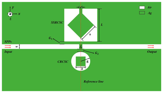 The envisioned waveguide for the MIM waveguide is shown in Figure 1, which is composed of a square split-ring cavity with a square center (SSRCSC), a circular ring cavity with a square center (CRCSC), and a waveguide with a silver baffle for a bus. Silver and air are represented by the white and green regions, respectively. A silver baffle was added to the upper part of the square ring, in order to obtain sufficient distances between Fano resonances for measuring multiple parameters at the same time, and increase the sharpness and transmittance of Fano resonances for realizing larger sensitivity and lower slow light. , , , , , and are the width of this silver baffle, the side length of the external square of the SSRCSC, the side length of the internal square of the SSRCSC, the radius of the external circle of the CRCSC, the side length of the internal square of the CRCSC, the distance between the SSRCSC and the bus waveguide, and the distance between the CRCSC and the bus waveguide, respectively. To ensure that only the basic transverse magnetic mode may exist in this configuration, the bus waveguide’s width is specified as 50 nm. The silver baffle in the center, whose width is given by , blocks the bus waveguide. The SSRCSC, CRCSC, and bus waveguide all have geometric centers that are on the reference line, so the overall waveguide is symmetrical about the reference line.