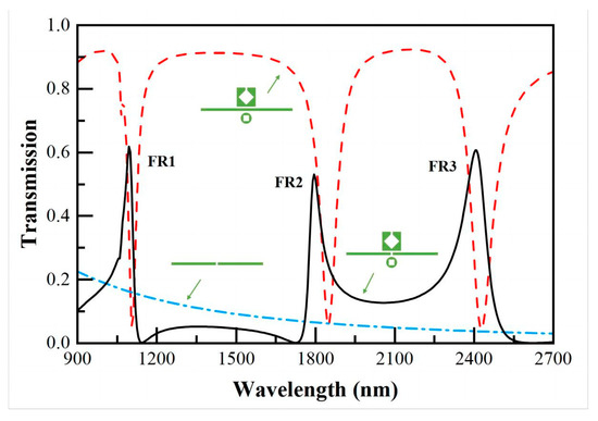 As shown in Figure 2, we set the waveguide in SSRCSC with the CRCSC’s mode, single bus waveguide mode, and full waveguide mode to illustrate the mechanism of Fano resonance generation. The bus waveguide with the silver baffle removed produced three transmission dips at 1107 nm, 1849 nm, and 2428 nm, which, as represented by the red line, may be thought of as a narrow discrete state. The blue line represents the state produced by the bus waveguide, which is a wide continuous state. The entire waveguide generated three asymmetric and sharp Fano resonances at 1097 nm, 1795 nm, and 2407 nm, known as FR1, FR2, and FR3, as a consequence of interference between the discrete state and continuous state.