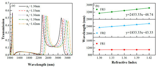 (a) The effect of different refractive indexes of CRCSC on waveguide Fano resonance (n1 = 1.00). (b) Associations between the index of refraction of the CRCSC and the resonance wavelengths of FR1, FR2, and FR3 that are linear.