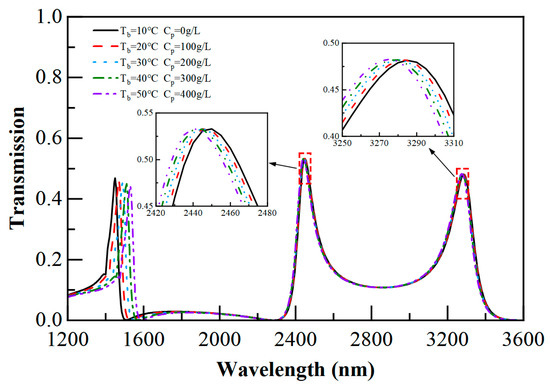 The waveguide’s transmission spectra at various plasma concentrations and blood temperatures.