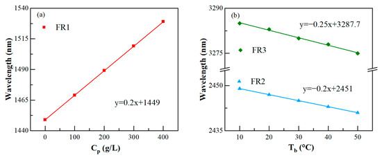 (a) FR1’s resonant wavelength versus plasma concentration. (b) The resonant wavelengths of FR2 and FR3 versus human blood temperature.