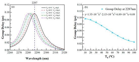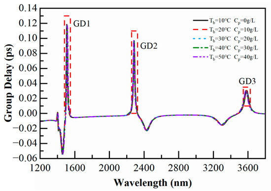 As a result of the sharp characteristics of Fano resonance, three group delay peaks can be found near the three Fano resonances, marked as GD1, GD2, and GD3. Then, we verified the proposed conjecture by measuring the biological parameters in the waveguide. In Figure 8, the human blood temperature in the SSRCSC increased with an interval of 10 °C, while the plasma concentration in the CRCSC increased with an interval of 10 g/L. It can be seen that GD1 experienced a redshift, while GD2 and GD3 experienced a blueshift. Subsequently, we locally enlarged GD1, GD2, and GD3, as shown in Figure 9a, Figure 10a, and Figure 11a. We selected the wavelength corresponding to the group delay peak at a temperature of 10 °C and concentration of 0 g/L as the reference wavelength, which was 1508 nm, 2287 nm, and 3585 nm for GD1, GD2, and GD3, respectively. We also plotted the response of the group delay to the biological parameters at each reference wavelength, as shown in Figure 9b, Figure 10b, and Figure 11b. The responses of the group delay to the two biological parameters were not exactly the same. For plasma concentration, it can be seen in Figure 9b that in the initial stage of concentration increase, group delay rapidly decreased. However, after the concentration was high, although the step size of concentration increase was still 10 g/L, the speed of the group delay decreased significantly. In b and 11b, it can be seen that for human blood temperature, the response of GD2 changed slowly during the low and high temperature stages, while the response of GD3 was different. For GD3, at relatively low temperatures, group delay slowly decreased with increasing temperature, and after a certain degree of temperature increase, the response of the group delay to temperature became faster.