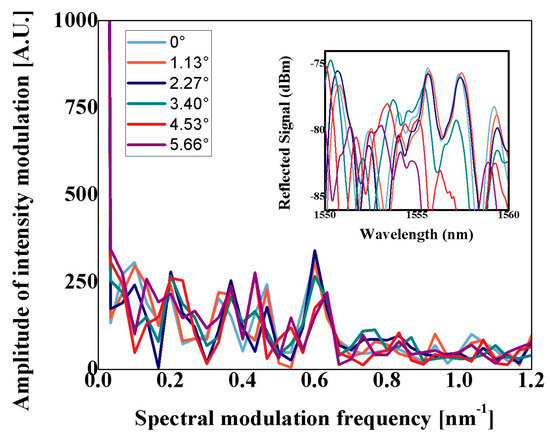 As can be appreciated inset Figure 4, the interference spectrum of RMMI shows a nonlinear response in terms of intensity and wavelength shifting when the deflection angle is increased; Here, for small angles, minimal wavelength shifting can be appreciated. Moreover, when the angle increases, an overlap wavelength spectrum occurs between the initial angles and the maximal angle variation (see inset Figure 4). In addition, the nonlinear wavelength shifting is related to the several modes exited and their interaction among them. In addition, the modes are significantly altered as the slight angle is modified. Furthermore, new modal components are generated, and these components interact with the initial modes. In addition, in Figure 3, it can be appreciated that the distance between the modes is minimal; as a result, they easily interact among them; however, this interaction compromises a linear response in the wavelength spectrum when a physical parameter is applied. It is important to notice that the Fourier spectrum is similar to the expected transmission mode for multimode interferences devices; however, in the reflection modes, the forward-backward light propagation provides a double optical path.