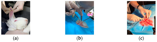 In this study, a white rabbit was used as an experimental sample. The rabbit was treated with cough suppression, analgesia, and anesthesia before the experiment [29]. As shown in Figure 2a, anesthetic drugs were injected intravenously. After the anesthetic treatment, the rabbit was in a sleeping state. The hairs on the abdomen of the rabbit were removed, and dissection was performed (Figure 2b). As shown in Figure 2c, the small intestinal tissue of the rabbit was exposed by the physician. Then, the blood supply to a portion of the intestine was blocked, and the model of ischemic necrosis of the small intestinal tissue was developed by experienced doctors. Vascular clamps were used to clamp the mesenteric vessels in the right place, blocking the flow of blood to the downstream part of the intestinal tissue. A suture was also used to ligate the site of ischemic necrosis by blocking the collateral circulation between the normal and ischemic parts of the intestine. The rest of the mesenteric vessels and intestinal canal were with normal blood flow through the mesenteric artery to the intestinal tissues [29]. In this way, a control group was formed.