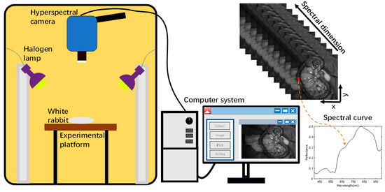 Acquisition of small intestine biopsy data from rabbits using a self-built hyperspectral acquisition system is displayed in Figure 3. The system mainly consists of a hyperspectral camera, a halogen light source, data acquisition software, and an optical darkroom [29]. The hyperspectral camera (SOC710VP, San Diego, CA, USA) has a spectral range of 376–1038 nm and a spectral step size of 4.69 nm in 128 bands. The spatial resolution of the images under each band was 696 × 520. A halogen lamp (LOWEL PRO, Burbank, CA, USA) was used as the light source for the system, which covered the operating wavelength of the hyperspectral camera. The hyperspectral camera lens recorded the photographs of small intestinal tissue vertically downward, and the halogen light source was maintained at 45° on both sides of the sample to provide uniform and stable light intensity to the sample tissue region. A data acquisition software, Hyper-Scanner (SOC, San Diego, CA, USA), was applied, which allows the computer to acquire raw hyperspectral information of small intestinal tissues. In order to avoid contamination by ambient light, all samples were collected in a dark room with a size of 2 m × 1.5 m × 2 m. The hyperspectral system acquired small intestine tissue data with 128 bands of spectral information per pixel point.