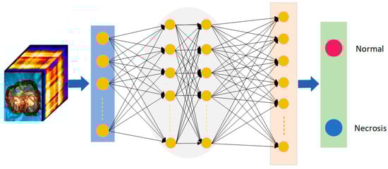CNN is a classic deep learning algorithm. It is used in pattern recognition and feature extraction in various scenarios. CNN is a deep feedforward neural network with the characteristics of local connection and weight sharing [23]. The entire structure of a CNN consists of an input layer, a hidden layer, and an output layer, where the hidden layer contains a convolutional layer, a pooling layer, and a fully connected layer. In recent years, there have been many applications of CNN combined with HSI in the medical field [16]. Figure 4 shows the input of hyperspectral image information of small intestinal tissue into the CNN model. The trained model has objectively discriminated between normal and ischaemic necrotic areas in small bowel tissue. The model contains a large number of neurons and parameters internally.