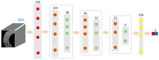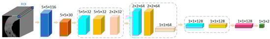The network structure of this case is shown in Figure 6. The input size of the training data for the model was 5 × 5 × 116. The spatial dimension of each patch was 5 × 5, and the number of spectral channels was 116. The PCA was first scaled down in the spectral dimension to 5 × 5 × 30. The size of the first layer of convolution kernels was 3 × 3, the number of kernels was 32, the padding was 1 × 1, and the step size was 1 × 1. After the first layer of convolution, the size became 5 × 5 × 32. The pooling layer size was 2 × 2, and the step size was 2 × 2. After the first pooling layer, the data size became 2 × 2 × 32. The size of the second layer convolutional kernel was 3 × 3, with a number of 64, a padding of 1 × 1, and a step size of 1 × 1. The pooling size for this layer was 2 × 2, and the step size was 2 × 2. After this layer, the data size was 1 × 1 × 64. The size of the third convolution kernel was 1 × 1, and the number was 128. After the third convolution layer, the size becomes 1 × 1 × 128. After the fully connected layer, the output dimension was 2.