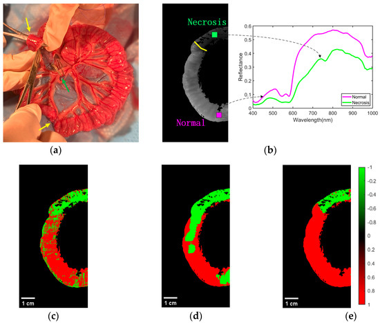 The time required to scan the entire sample was about 6 s. In order to explore the direct application of HSI in a real clinical setting, we macroscopically captured small intestine biopsy tissue information through a hyperspectral camera. The light penetrated the intestinal wall of the small intestine and was absorbed by substances such as water, oxyhemoglobin, and deoxyhemoglobin in the biological tissues. Based on the difference in the reflected spectral information between normal and ischemic necrotic areas of small intestinal tissue, the normal and necrotic areas of small intestinal tissue were identified. In the actual acquisition process, specular reflection was observed due to local areas of wetness on the surface of the living tissue. This was observed in the localized areas of exposure; however, no significant impact was noted on the ability to distinguish between normal and necrotic sites of small intestinal tissue.