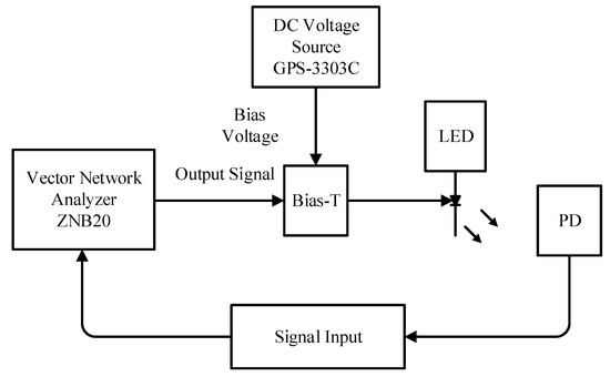 The experimental system diagram and setup are illustrated by Figure 2 and Figure 3, respectively. The system in Figure 3 consists of the following blocks: signal source, bias setup, LED transmitter, photodiode (PD) receiver, and vector network analyser (VNA). The signal source is the ZNB20 vector network analyser produced by Rhode & Schwartz. The VNA can produce bipolar signals, , from 100 KHz to 20 GHz. The bias voltage, , is provided by a multi-channel linear DC voltage source, GPS-3303C. The PD is S10784 silicon photodiode. The Bias-T, ZFBT-4R2GW+, has a passband of 0.1–4200 MHz and can generate , such that the input for LED is VNA, . The output of PD, , is fed back to VNA. Then, comparing and , the frequency domain channel response can be estimated. Since the bandwidths of PD and Bias-T are much larger compared with that of LED, the estimated mainly relies on and can be approximated as the frequency domain characteristic of LED.