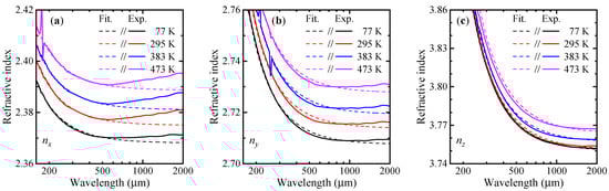 The long-wavelength tails of the refractive indices along the x- and y-axes decrease in proportion to the square of the temperature change upon cooling. The behavior of the refractive index along the z-axis is linear with respect to the temperature change. The upward deviation from the straight line of the long-wavelength tails of the refractive indices along the x- and y-axes may be related to diffraction in the thick samples, which is also confirmed by the presence of an interference pattern in the long-wavelength region of the absorption spectra in Figure 3a,b. Due to this fact, experimental points with a wavelength >1000 µm were omitted during the fitting process. Temperature-dependent Sellmeier coefficients were found in the vicinity of the values corresponding to the room temperature (1).