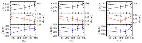 The temperature dependence of the fitted Sellmeier coefficients for all principal axes is shown in Figure 5 and Table 1.